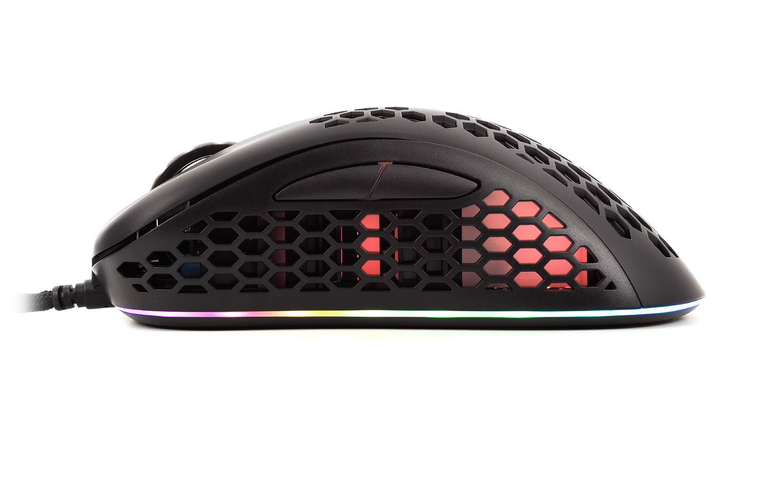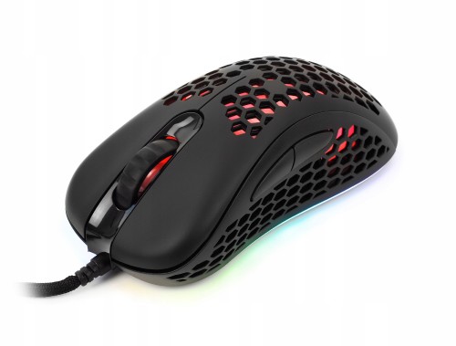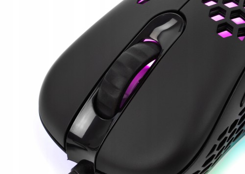 Za efektowny wygląd myszki na biurku odpowiada technologia True RGB. Perforowana obudowa myszki z wycięciami w kształcie plastrów miodu sprawia, że podświetlenie rozchodzi się po całej powierzchni myszki, co sprawia, że prezentuje się niesamowicie, szczególnie w ciemnym pomieszczeniu.