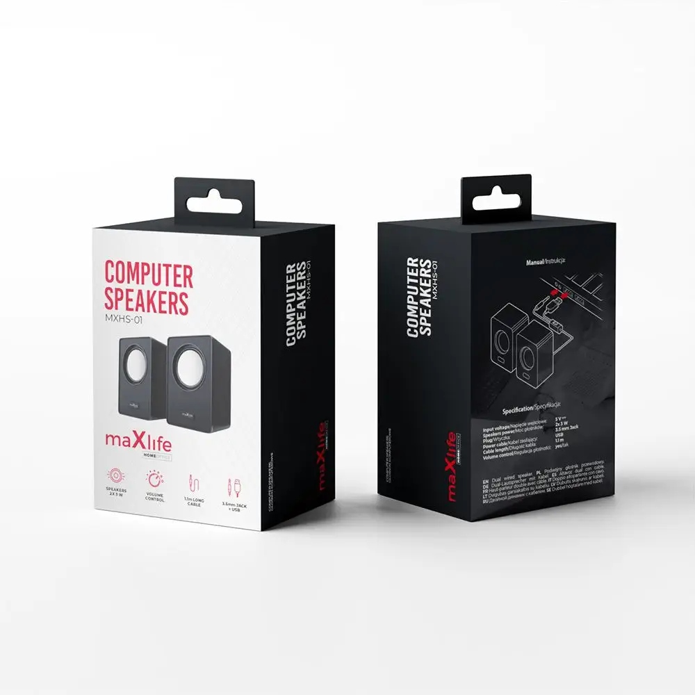Głośniki komputerowe MXHS-01 to produkty z serii Home Office od Maxlife. Home Office charakteryzuje się minimalistycznym wzornictwem. W zestawie znajdują się dwa głośniki o mocy 2 x 3 W. Kabel długości 1,1 m zakończony podwójnym złączem (USB i 3,5 mm mini-jack) wyposażony jest dodatkowo w regulację głośności.