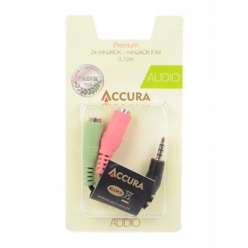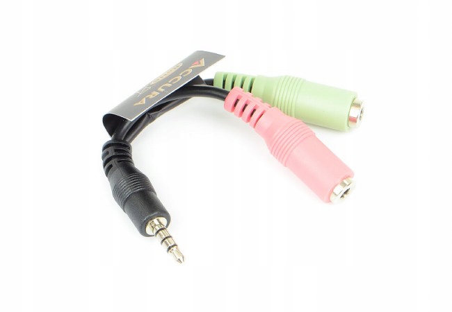 Adapter Accura umożliwia podłączenie słuchawek komputerowych wyjściem 2 x miniJack (3.5 mm) do komputera lub tabletu z pojedynczym wejściem miniJack Wystarczy podłączyć złącza zestawu słuchawkowego zgodnie z kolorami żeńskich portów adaptera.