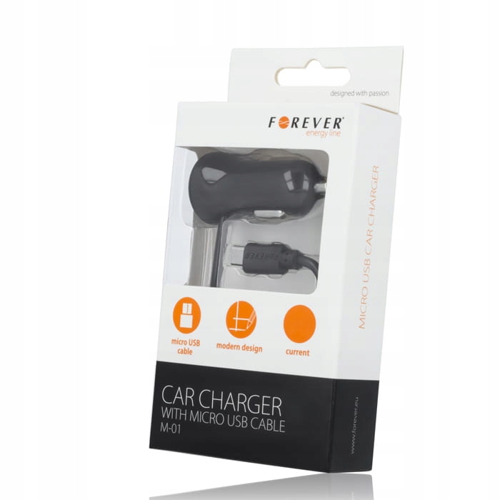 Ładowarka samochodowa Forever M-01 to akcesorium, które doceni każdy zmotoryzowany użytkownik urządzeń mobilnych. Ładowarka wyposażona została w 1,5-metrowy przewód zakończony złączem microUSB. Ładowarka może być podłączona do samochodowego gniazda, pracującego z napięciem 12 V oraz 24 V, na wyjściu dając stabilne napięcie 5 V. Prąd ładowania wynosi 750 mA, dzięki czemu moc urządzenia to bezpieczne 3,75 W.
