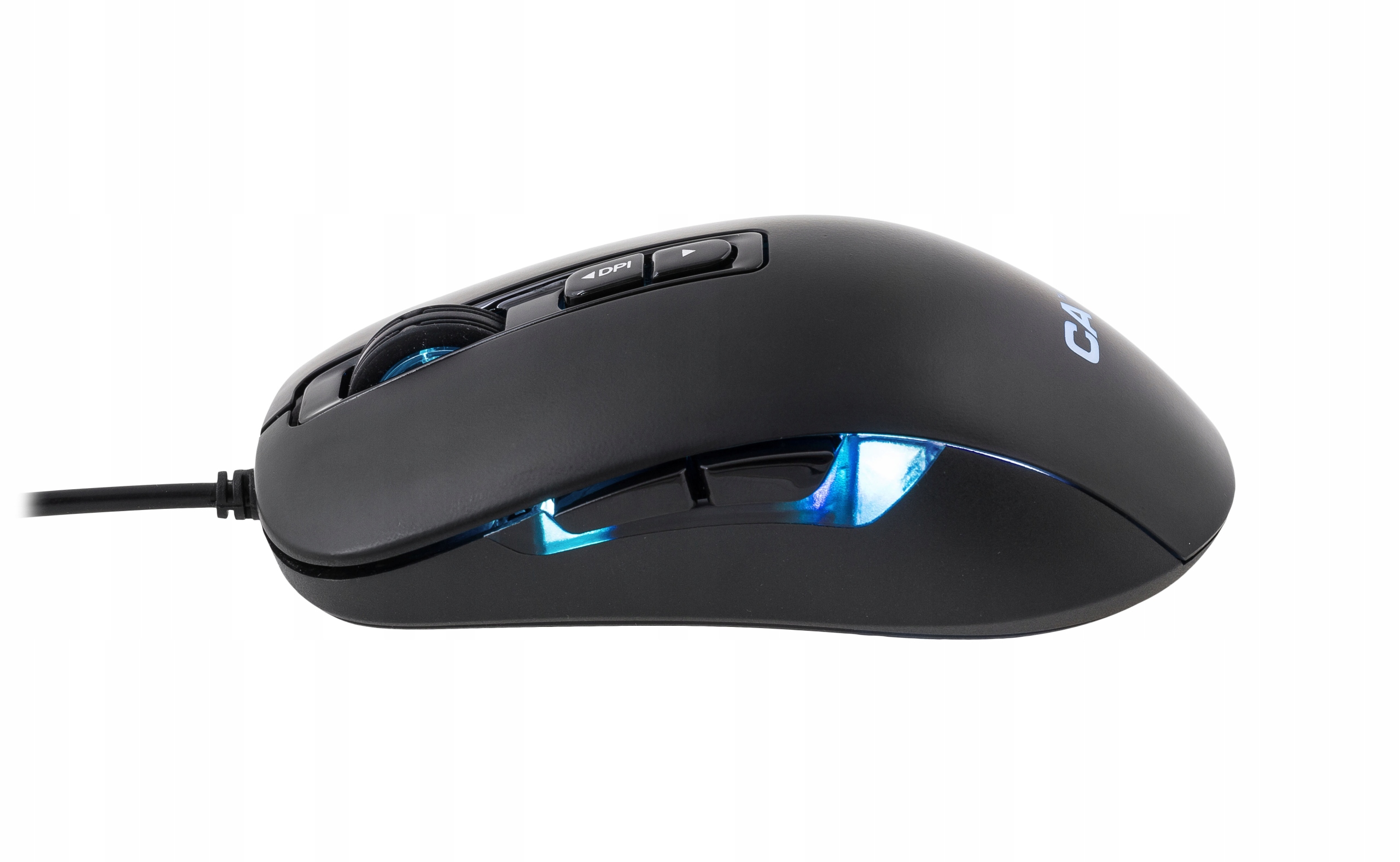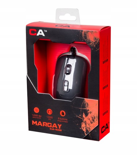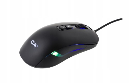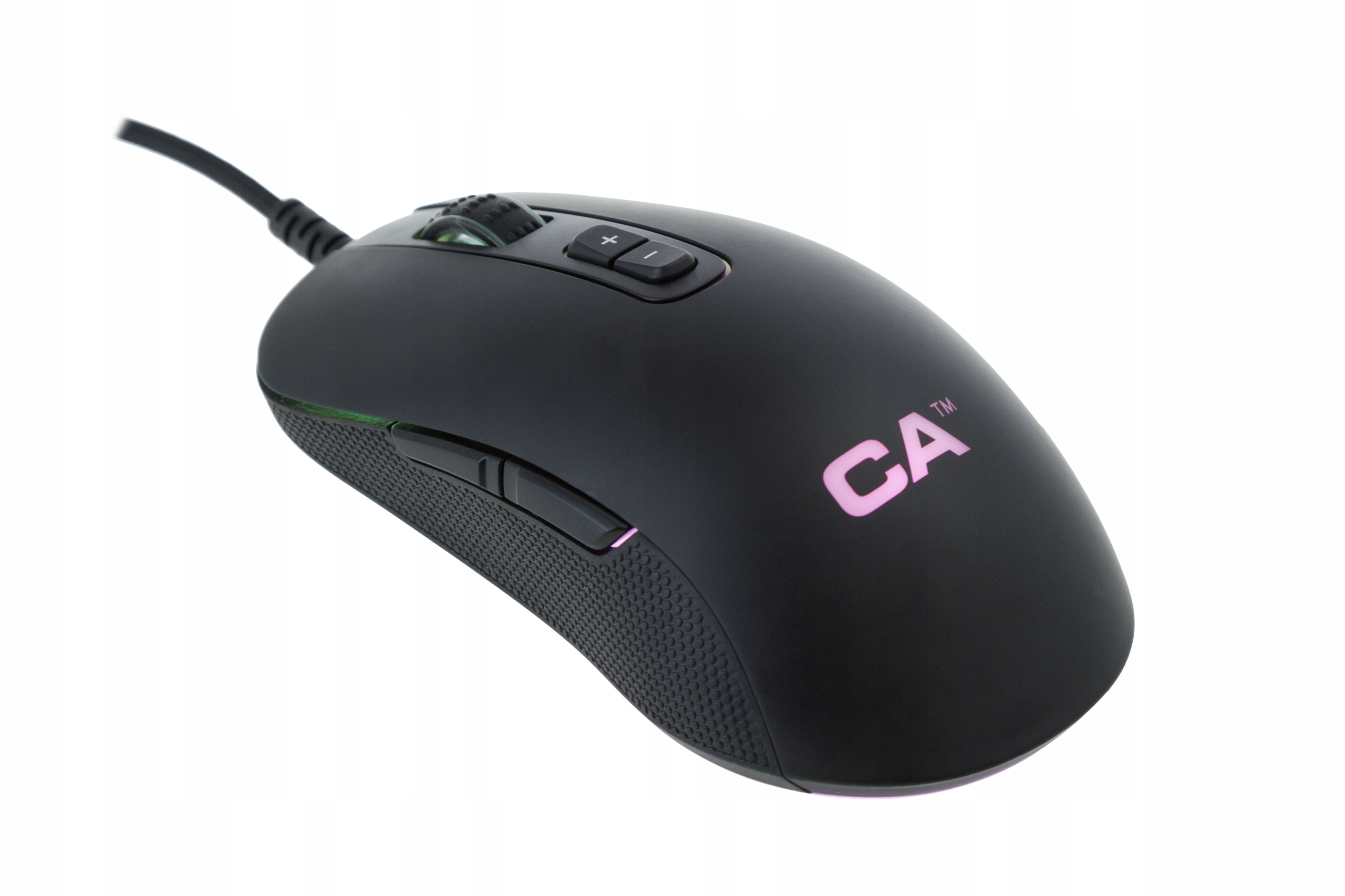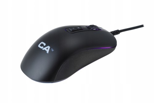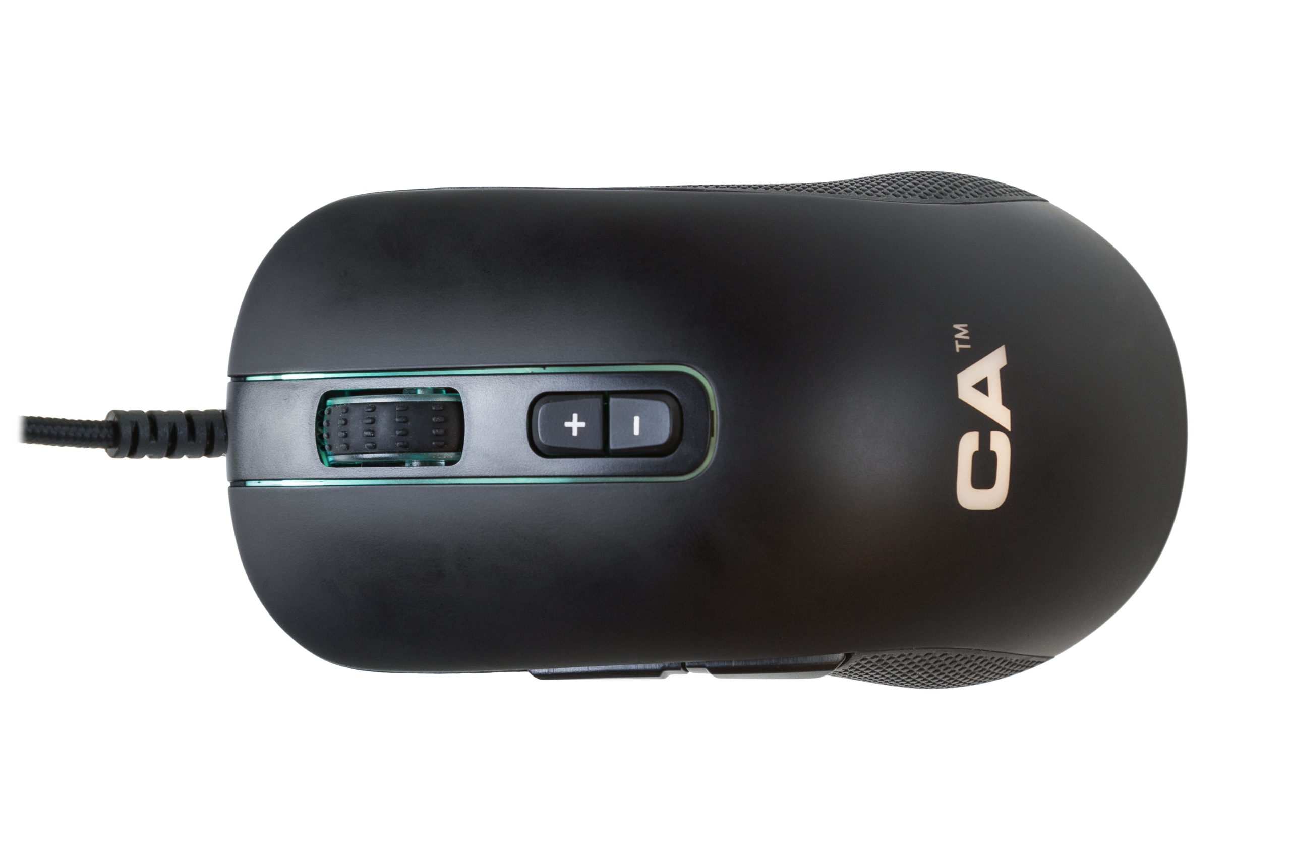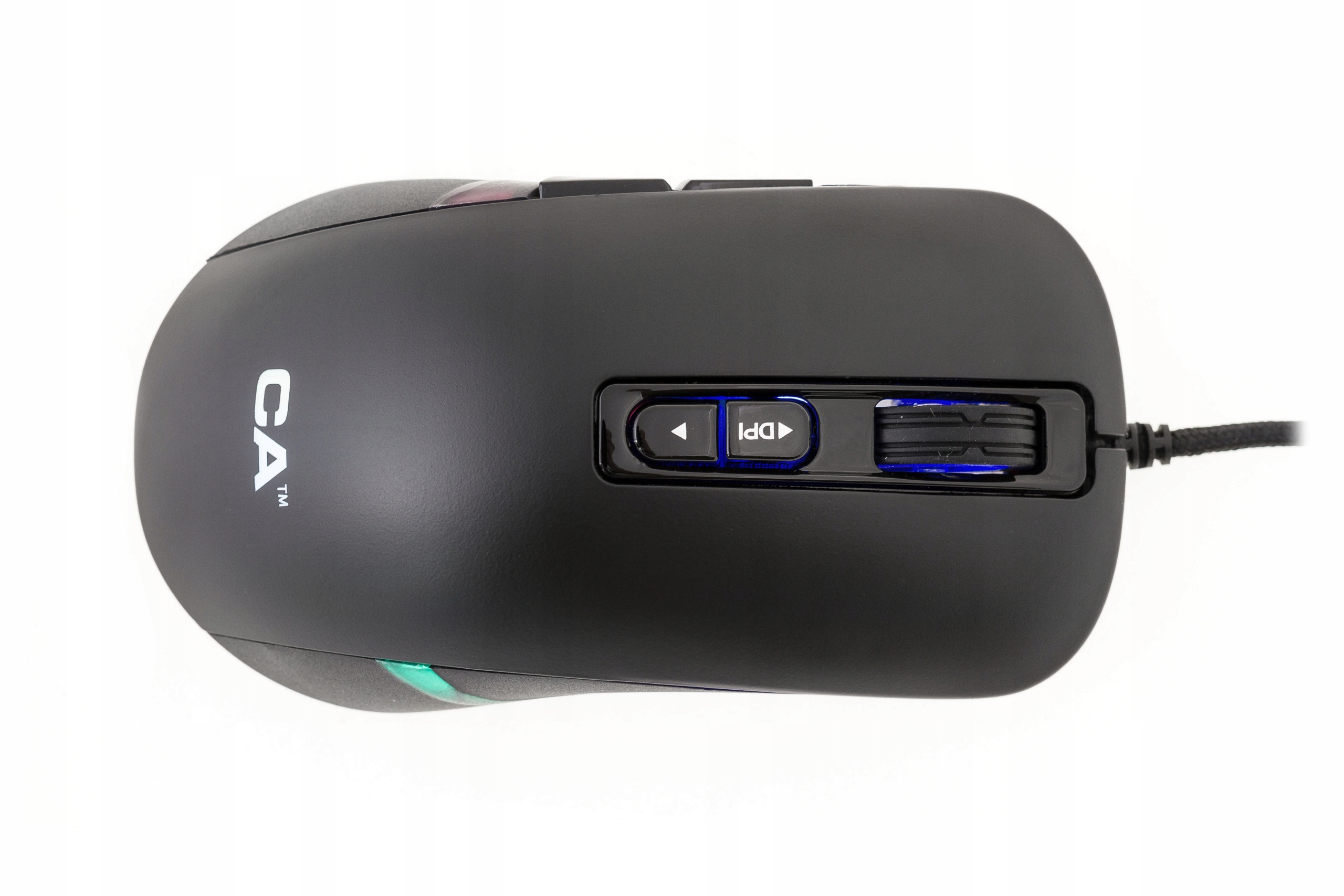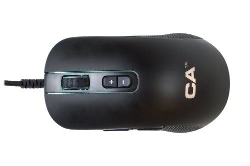 Czerń ożywiają podświetlane elementy elegancko wtopione w matowy, delikatnie chropowaty plastik, z którego wykonany jest grzbiet myszki. Widnieje na nim podświetlane logo CA, dzięki czemu nasz sprytny „gryzoń” zadaje szyku. Margay jest rozświetlony także przy rolce oraz lamówce wokół myszki w jej dolnej części. Iluminacje widoczne są także pomiędzy przyciskami i bocznymi panelami oraz w przestrzeniach pomiędzy przyciskami głównymi.