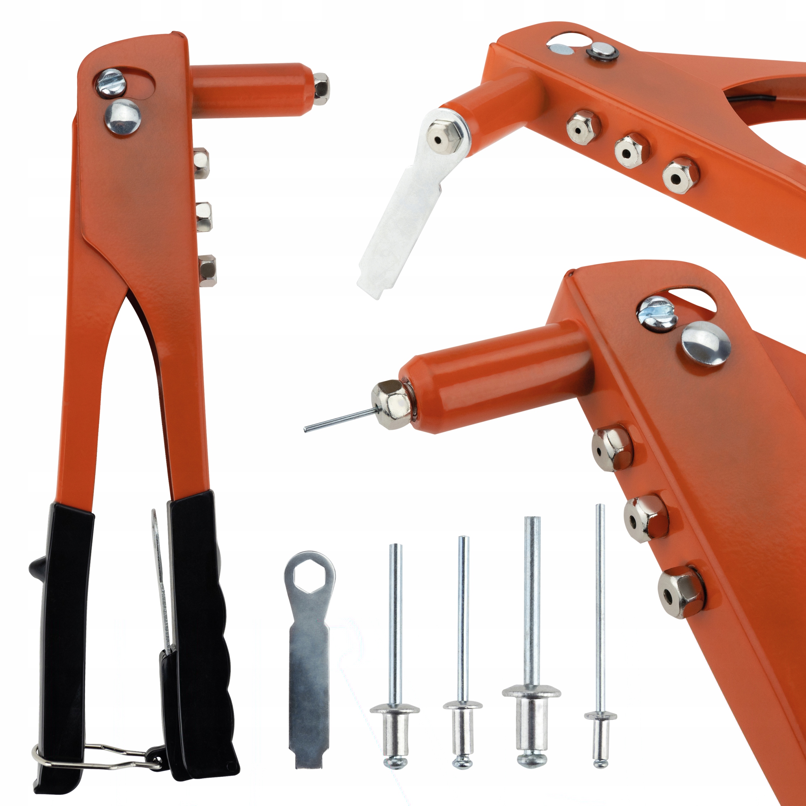 Nitownica o długości całkowite j24 cm wykonana z wysokiej jakości stali. Rękojeść pokryta antypoślizgową gumą i wyposażona w blokadę przed otwieraniem. Dzięki wymiennym końcówką, umożliwia łączenie elementów nitami o 4 średnicach: 2,4 mm, 3,2 mm, 4 mm, 4,8 mm. Dodatkowo w rączce umieszczono klucz sześciokątny do odkręcania i przykręcania końcówek.