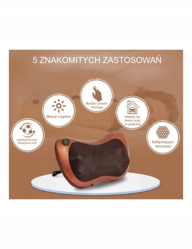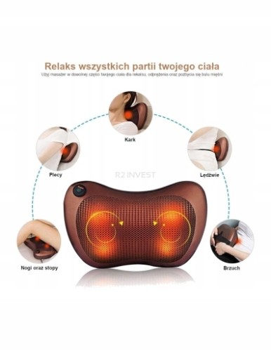 Poduszka masująca z funkcją podgrzewania wyposażona jest w cztery głowice masujące. Masażer zapewnia odpowiedni masaż i rozluźnienie w okolicach karku, kręgosłupa, pleców oraz nóg. Kulki masujące znajdują się pod specjalną tkaniną, która pozwala oddychać skórze podczas masażu. Poduszka masująca posiada również lampy z podczerwienią, które rozgrzewają ciało w trakcie masażu, dając uczucie komfortu i relaksu.