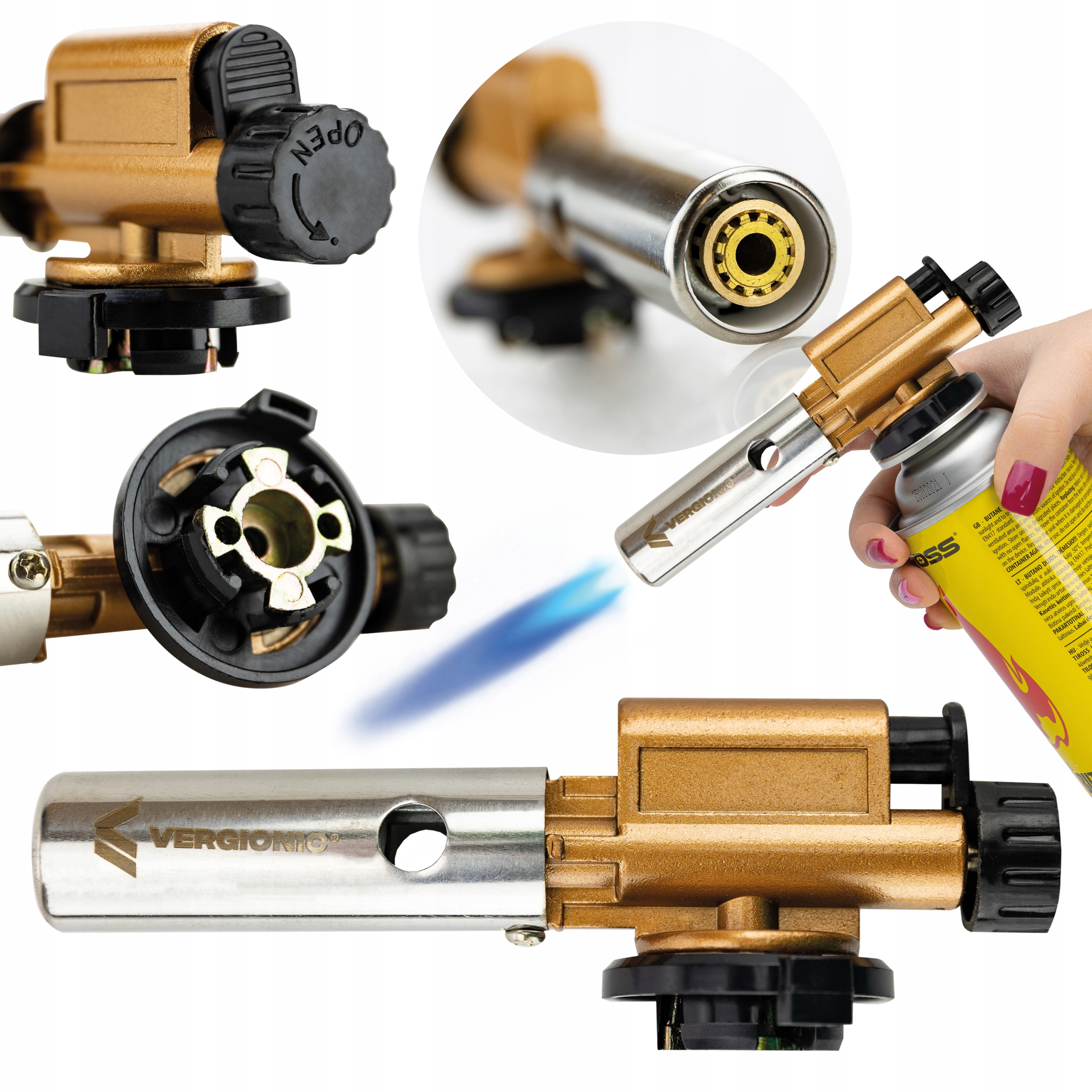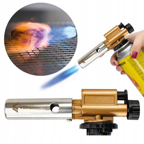 Jest prosty w obsłudze, nie wymaga stosowania zapałek – wystarczy nacisnąć przycisk, który wywołuje iskrę i rozpala strumień gazu. Kompatybilny z gazowymi kartuszami TS-700 typu twist.