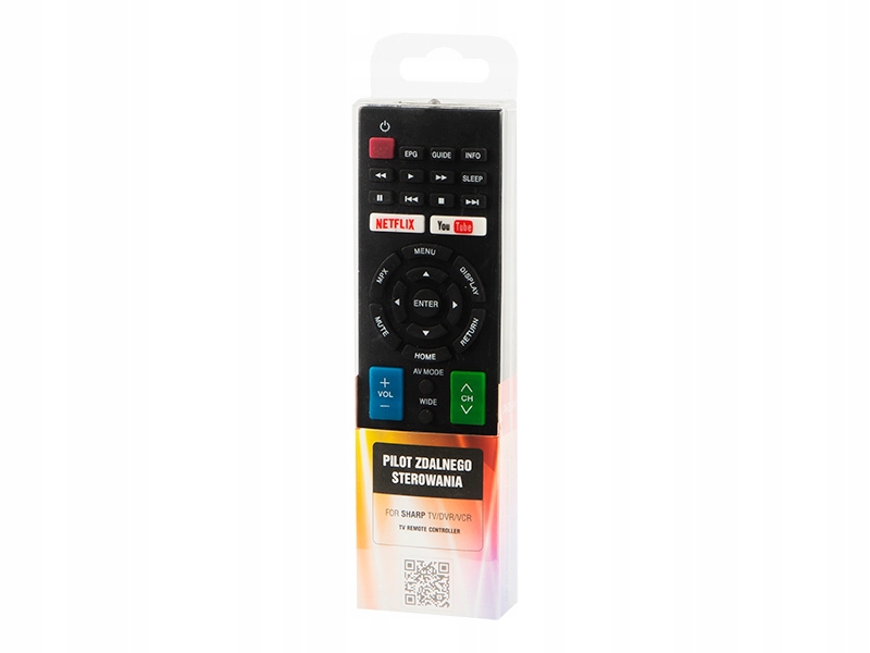 Uniwersalny pilot umożliwiający sterowanie następującymi urządzeniami marki Sharp: TV, VCR, DVR. Produkt posiada niezbędne przyciski do podstawowej obsługi wspomnianych urządzeń, a dodatkowo oddzielne przyciski do uruchomienia popularnych serwisów Netflix oraz Youtube. Prosty design i układ zapewnia w pełni łatwą i intuicyjną obsługę. Do produkcji pilota użyto materiałów wysokiej jakości zapewniających trwałość produktu na długi czas. Idealnie sprawdzi się do kontroli Twojego urządzenia gdy fabryczny pilot zagubi się lub ulegnie uszkodzeniu.