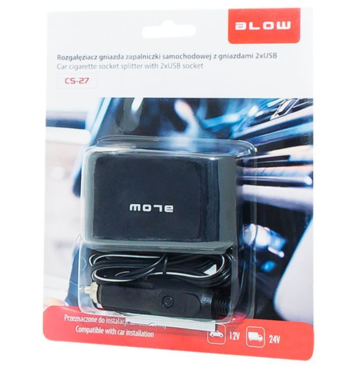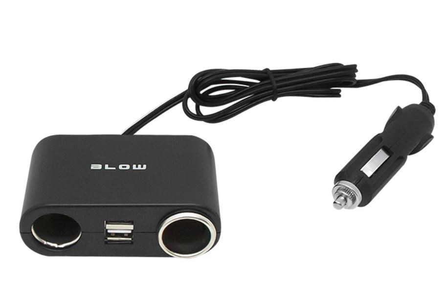 Rozgałęźnik podwójny gniazda zapalniczki samochodowej Blow z przewodem 50cm i dodatkowym portem USB.