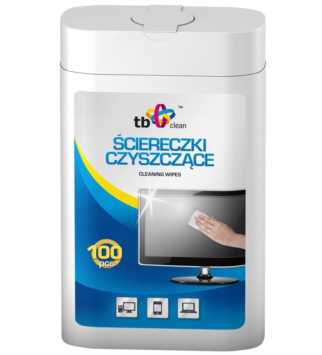 Specjalne mokre ściereczki czyszczące TB Clean - 100 szt. Idealne do usuwania kurzu oraz innych zanieczyszczeń z ekranów TFT/LED/LCD/Plazma, laptopów, ekranów płaskich, PDA i innych dotykowych wyświetlaczy, filtrów, powlekanych i częściowo niepowlekanych powierzchni szklanych (jak np. lustra, czytniki mikrofilmów, soczewki). Produkt nie zawiera alkoholu i jest niepalny, ma działanie antystatyczne.