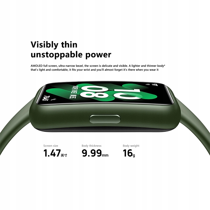 HUAWEI Band 7 posiada najcieńszy wyświetlacz FullView AMOLED w portfolio marki. Mierząc mniej niż 10 mm, zapewnia użytkownikom najwyższej jakości wrażenia. Lekka, zakrzywiona konstrukcja, która idealnie dopasowuje się do nadgarstka i waży zaledwie 16 g (bez paska), zapewnia użytkownikom niezwykły komfort. Smartband został wykonany z polimeru, dodatkowo wzmocnionego włóknem szklanym, dzięki czemu to drobne urządzenie jest jednocześnie wytrzymałe. Ultrasmukła konstrukcja nadaje mu szlachetności i elegancji, co niewątpliwie podbije serca konsumentów.