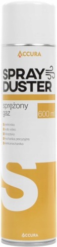 ACCURA Spray Duster - to technicznie czysta mieszanka gazów. Służy do wydmuchiwania kurzu i zanieczyszczeń z urządzeń takich jak klawiatury, obudowy, drukarki, kieszenie CD/DVD, sprzęt elektroniczny itp. Dla komfortu w przypadku trudnych w dostępie zabrudzeń dołączona jest rurka aplikacyjna. Produkt jest palny, dlatego przed użyciem wyłącz urządzenie i poczekaj aż wystygnie. Przed użyciem zapoznaj się z instrukcją czyszczenia producenta urządzenia.