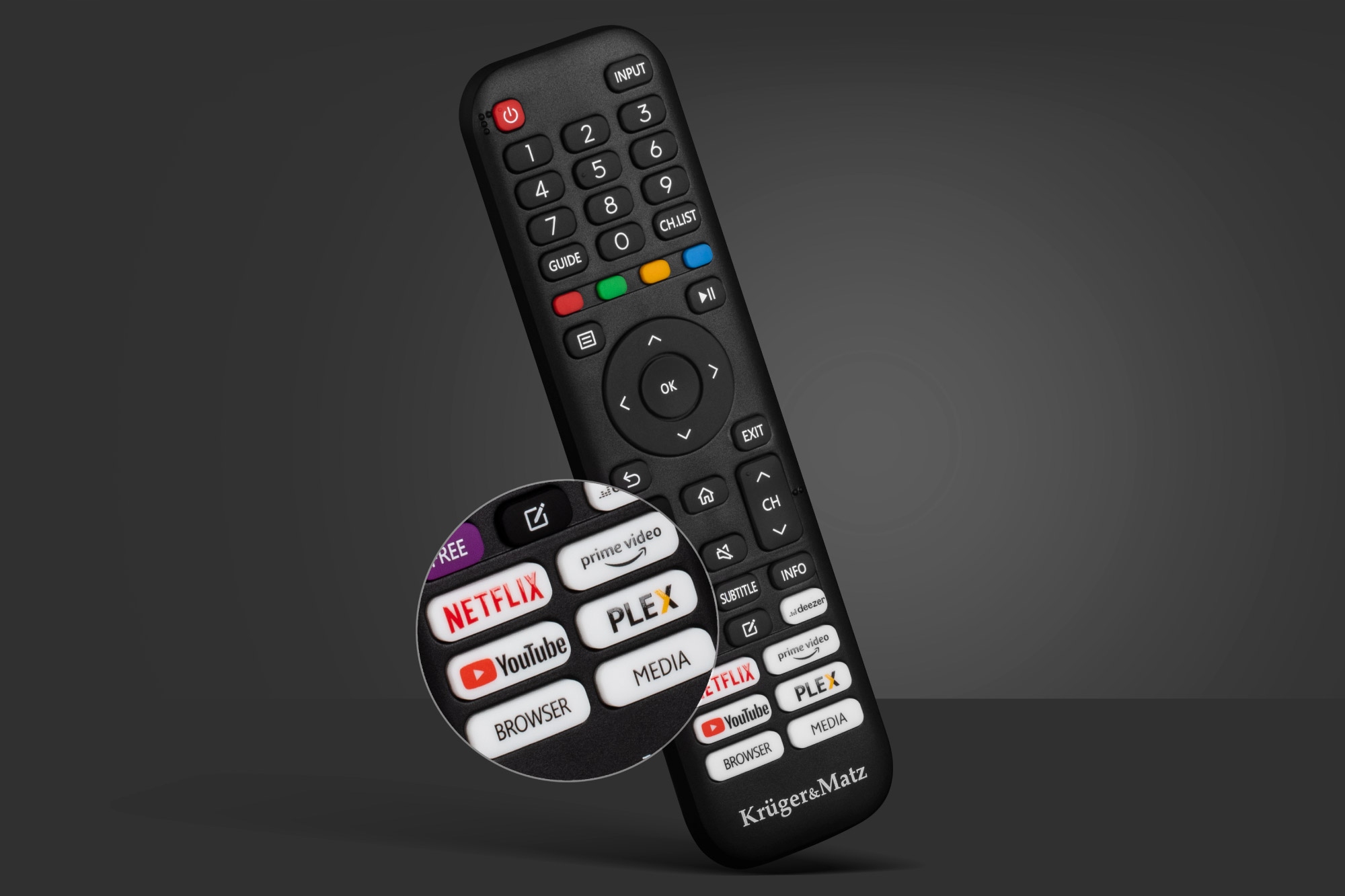 Dołączony do telewizora Kruger&Matz pilot został zaprojektowany z myślą o wygodnym i intuicyjnym użytkowaniu. Na pilocie znajdują się skróty do najpopularniejszych aplikacji, takich jak Netflix, YouTube czy Amazon Prime Video. Dzięki nim możesz szybko uruchomić ulubione treści bez konieczności przeglądania menu czy wyszukiwania aplikacji.