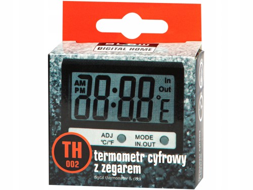 Termo-higrometr TH-002 to wysokiej jakości urządzenie do pomiaru temperatury na zewnątrz i wewnątrz pomieszczeń z funkcją zegara.