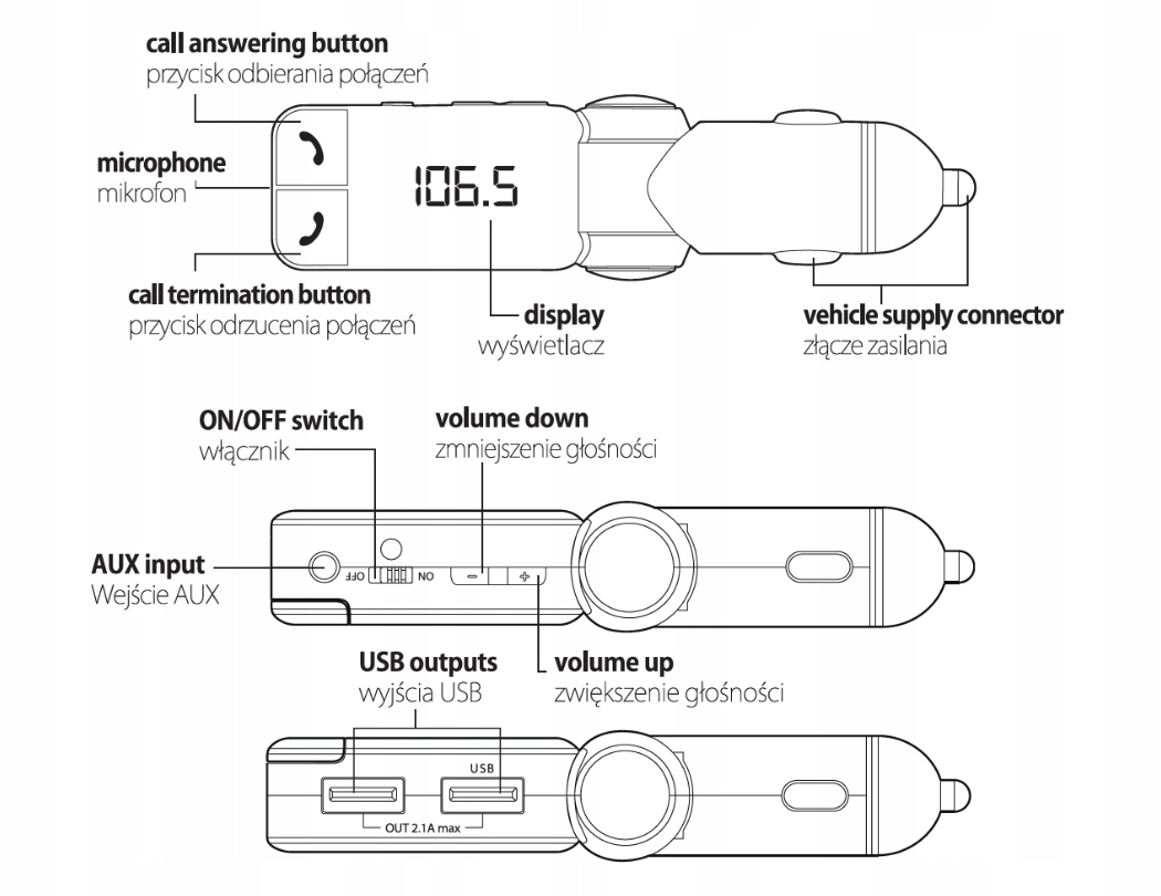 - Złącza: 2xUSB, AUX