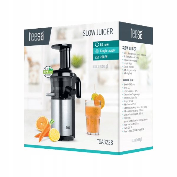 Lubisz zaczynać dzień od dawki witamin? Z pewnością pokochasz nową wyciskarkę wolnoobrotową Teesa do warzyw i owoców. Urządzenie jest wolne od BPA – to znaczy, że zostało wyprodukowane bez użycia materiałów zawierających bisfenol, co jest szczególnie ważne dla walorów zdrowotnych wyciskanego soku. Pionowa konstrukcja oraz obudowa ze stali nierdzewnej sprawiają, że wyciskarka nie zajmuje wiele miejsca na blacie i doskonale współgra z wyposażeniem nowoczesnej kuchni.