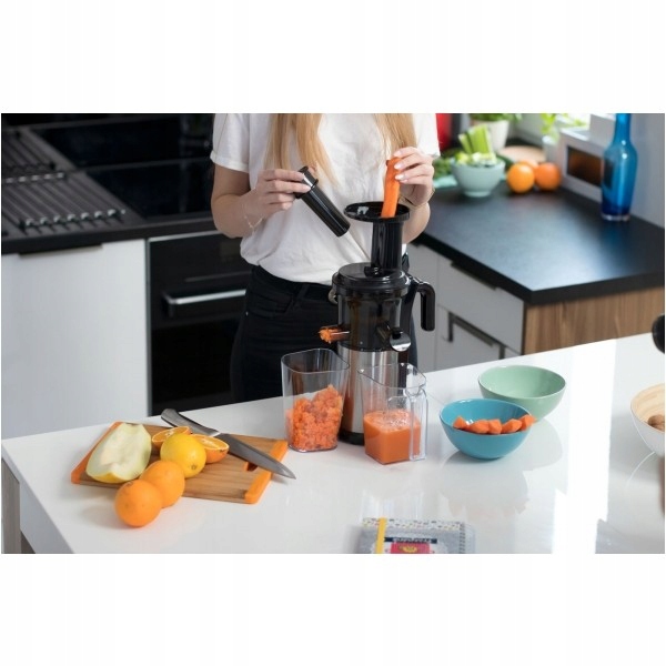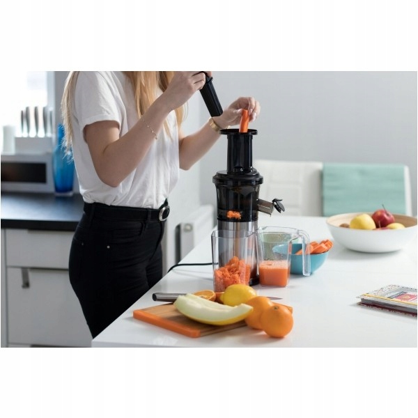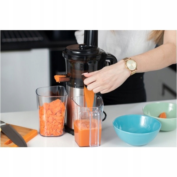 System jednoślimakowy, moc 200 W oraz prędkość w zakresie 40-65 obrotów/minutę zapewniają wysoką wydajności, która sprawi, że zawsze wyciśniesz maksymalną ilość soku. Zaletą jest bieg wsteczny, który pomoże Ci odblokować urządzenie, gdy podczas pracy zostanie ono zablokowane np. przez pestkę owocu.