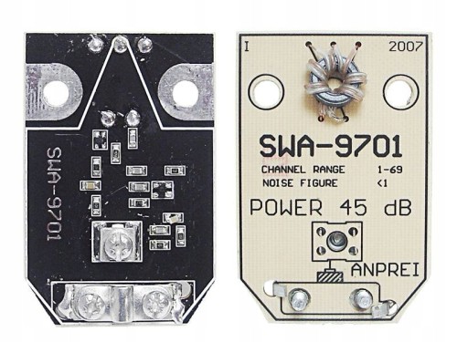 Wzmacniacz antenowy SWA-9701 służy do wzmacniania słabych sygnałów TV naziemnej analogowej i cyfrowej w formacie DVB-T MPEG-4. Wzmacniacz SWA-9701 jest przeznaczony do montowania bezpośrednio na zaciskach anteny w puszce antenowej. Takie rozwiązanie zapewnia wzmocnienie słabych sygnałów już na wejściu anteny, co jest szczególnie istotne przy niskim stosunku sygnału do szumów.