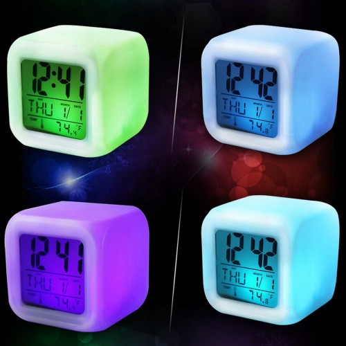 Zegar Kameleon to bardzo nowoczesny i funkcjonalny przedmiot. Posiada wbudowany budzik, kalendarz i termometr. Co więcej, ma 7 zmieniających się kolorów i 3 tryby świecenia. Przycisk DEMO i ON uruchamiają zmieniające się światło, natomiast klawisz OFF je wyłącza.