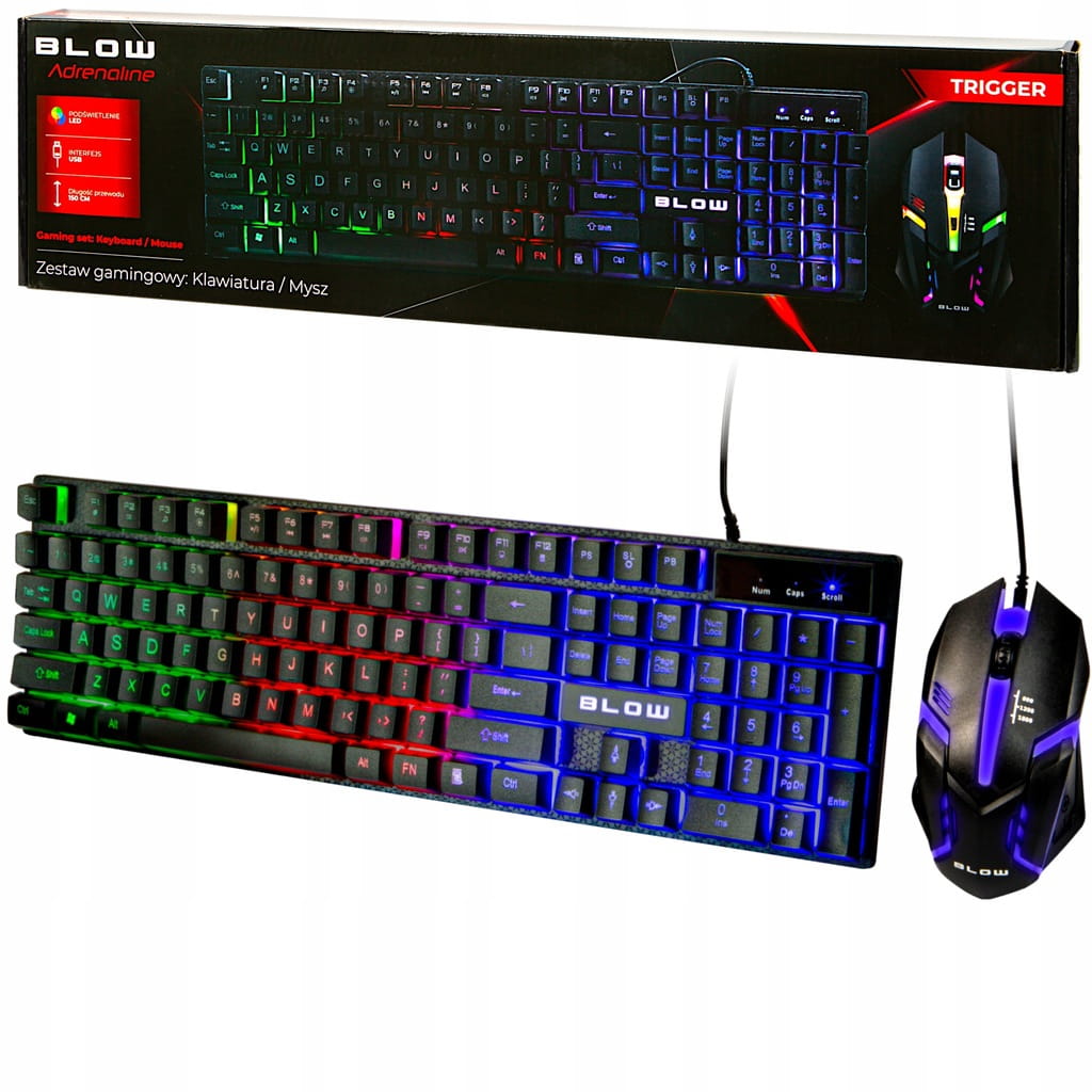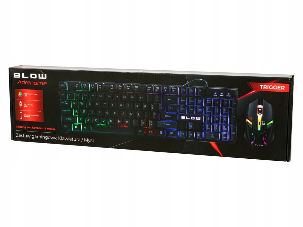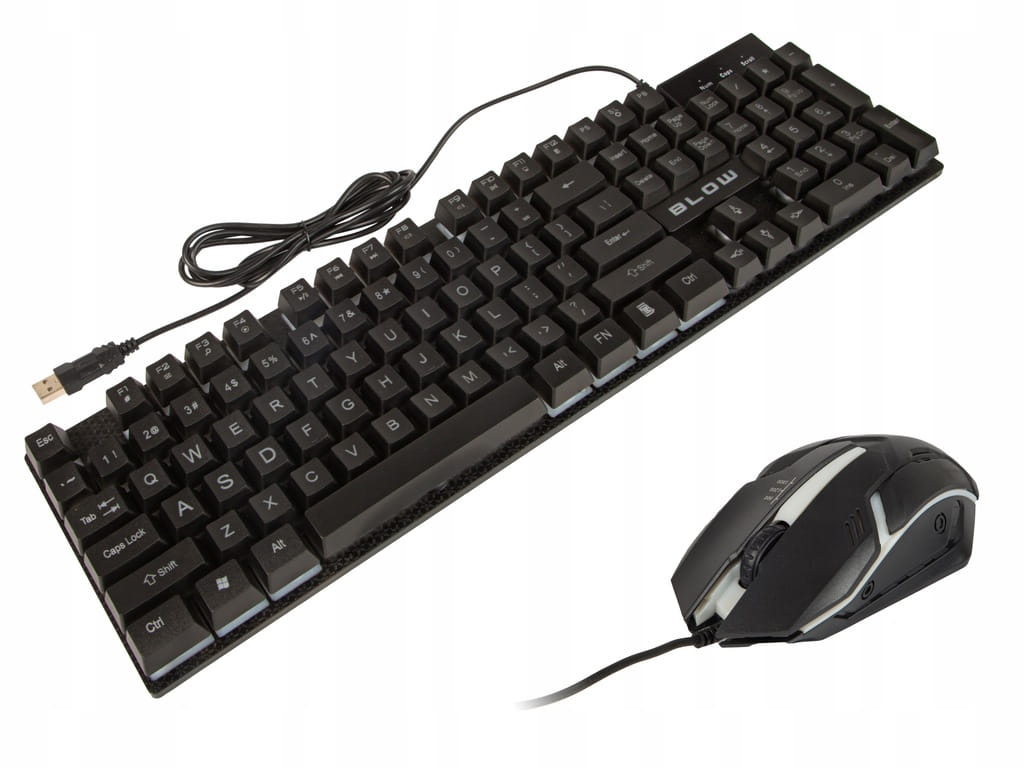 Zestaw marki BLOW składający się z podświetlanej klawiatury oraz myszki z 3 przyciskami i rolką. Obydwa urządzenia łączą się za pomocą interfejsu USB, a przewód każdego z nich ma ok. 1,5m długości. Zestaw przeznaczony głównie dla graczy którzy cenią sobie prostotę w połączeniu z nowoczesnością oraz bardzo eleganckie podświetlenie LED.