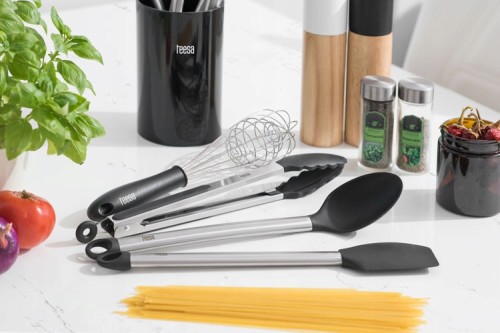 Przybory kuchenne Teesa zostały wykonane z wysokiej jakości nietoksycznego oraz przeznaczonego do kontaktu z żywnością silikonu. Odporny na ciepło materiał sprawia, że potrawy nie przywierają do powierzchni akcesoriów, co zdecydowanie podnosi komfort w czasie ich używania. Zastosowanie silikonu ma jeszcze jedną zaletę - chroni Twoje garnki przed zarysowaniami. Całość dopełnia wykonana ze stali nierdzewnej wygodna rączka, z funkcjonalnym zaczepem umożliwiającym powieszenie na wieszaku kuchennym.