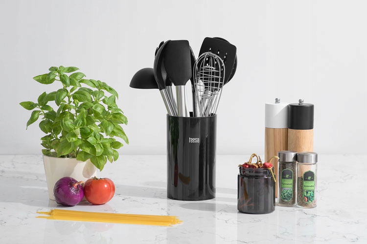 W skład zestawu wchodzą wszystkie niezbędne akcesoria, które pomogą Ci w przygotowaniu codziennych posiłków, np. chochla, łyżka do serwowania potraw oraz do spaghetti, łopatka i łyżka cedzakowa, trzepaczka i szczypce. Dołączony do zestawu pojemnik, w połączeniu z elegancją akcesoriów sprawi, że zamiast trzymać przybory w szufladzie, będziesz chciała je wyeksponować, by były zawsze pod ręką.
